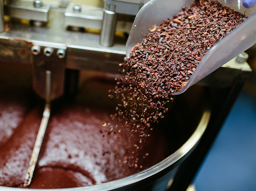 The entire chocolate grinding process takes place in a single machine (a melanger) for a minimum of 72 hours. After that, the chocolate is aged to ensure a silky-smooth texture and complex flavor.